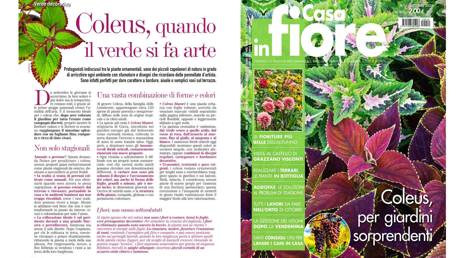 Questo mese la rivista “Casa in Fiore” dedica la copertina e un servizio di 5 pagine alla bellezza di queste straordinarie foglie variopinte: il Coleus fotografato nella preziosa collezione dei giardini dell’Isola Madre presenta una infinita varietà di disegni e colorazioni sempre nuove. Nel servizio il capo giardiniere Luigi Fiorna ci svela i segreti della coltivazione e dell’utilizzo di queste piante adatte a molteplici abbinamenti con altri tipi di fiori.